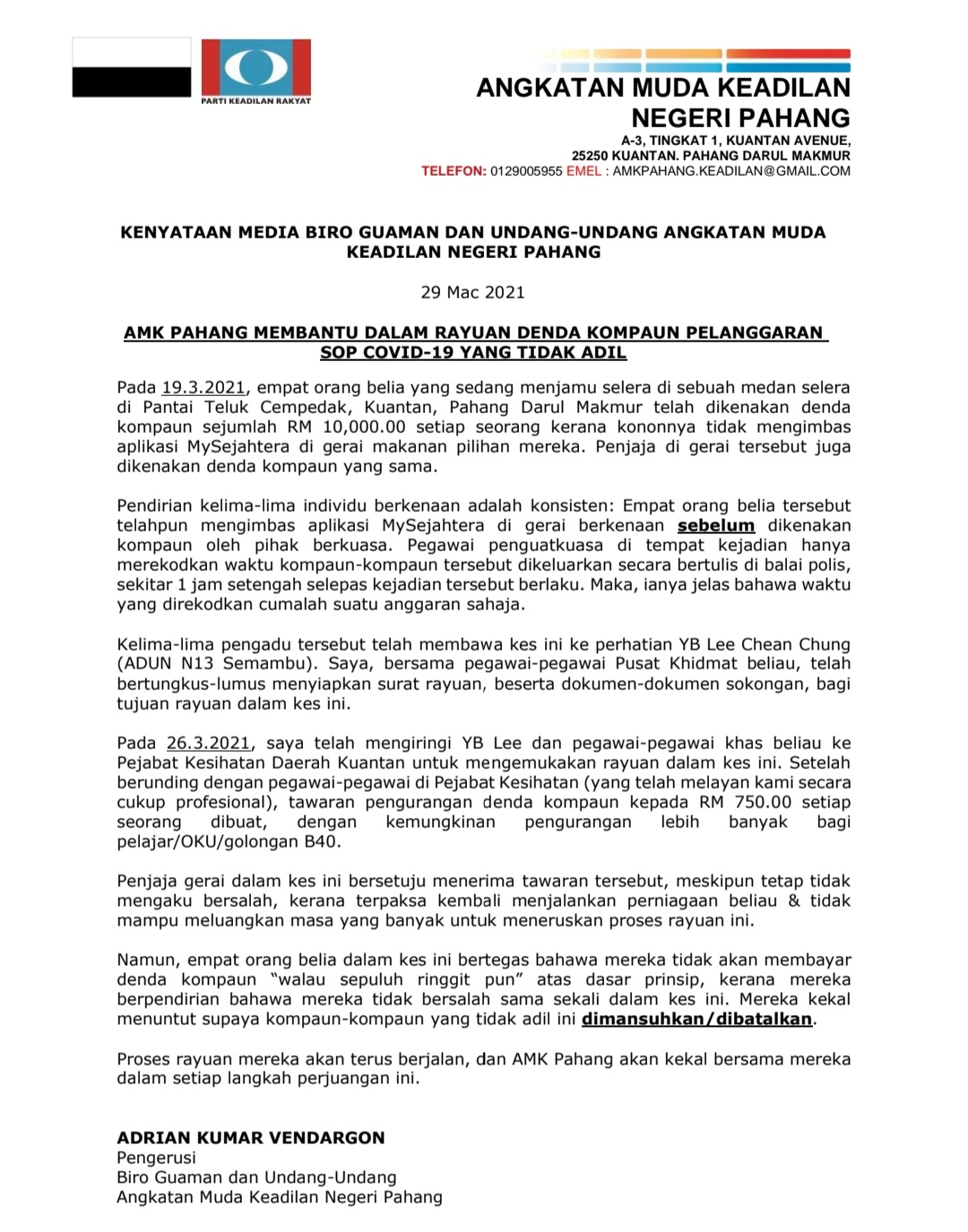 Adrian Kumar Vendargon Reformisnexgen On Twitter Kenyataan Saya Memaklumkan Perkembangan Berkenaan Kes Kompaun Pelanggaran Sop Covid 19 Di Kuantan Baru Baru Ini Cheanchung Amkmalaysia Keadilan Https T Co Heozymbrhg Twitter